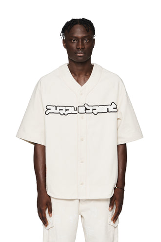 Defined by stylized Purple Brand logo lettering across the chest and a “P” at the hem, this button-down baseball shirt is classically tailored with short sleeves and a curved shirttail.