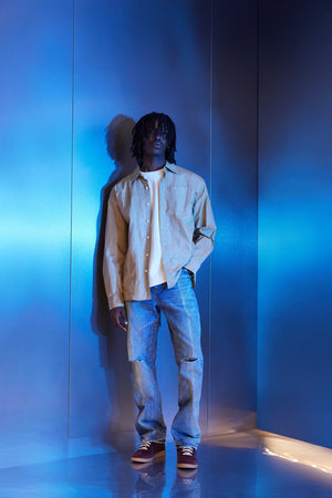 Our P011 is a mid-rise men’s jean, crafted from premium cotton denim with classic five-pocket construction that includes a button-fly closure and reinforced belt loops as well as hidden rivets and an inner lining on the back pockets for durability. It’s cut loose straight fit and comes in a mid indigo wash, with blowouts on both knees. A custom Purple cowhide leather patch, a back pocket flasher and a logo hangtag lend signature branded finishes.